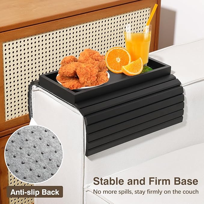 - ใ๐๐จ๐ง-๐ฌ๐ฅ๐ข๐ฉ ๐๐๐ฌ๐ข๐ ๐งใYou can put snack or drink on the couch tray with confidence. Bottom non-slip design keeps the tray stay firmly on couch and ensure the stability during use, preventing unnecessary slipping and protecting your sofa from dirty by food and drink.