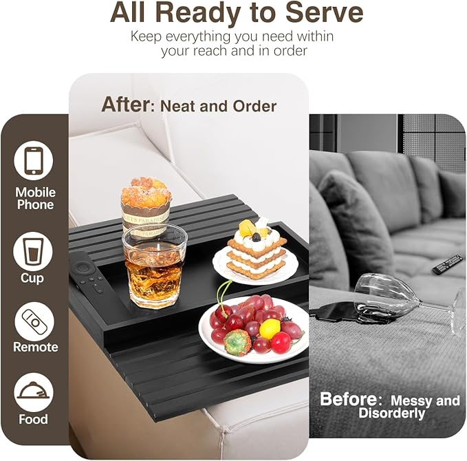 - ใ๐๐ง๐ฃ๐จ๐ฒ ๐๐จ๐ฎ๐ซ ๐๐๐ข๐ฌ๐ฎ๐ซ๐ ๐๐ข๐ฆ๐ใ Do you have trouble of finding the remote control and a place for your cup? Our couch arm table tray - a perfect and practical solution, easy access to remote control, drinks, snacks, phone and bid farewell to the messy sofa.