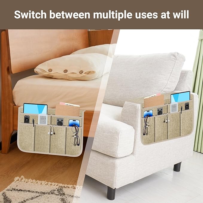- Protects Furniture & Prevents Scratches: By keeping items like remotes and keys contained within the soft fabric pockets, the caddy helps prevent scratches, spills, and wear and tear on your furniture's armrests.
