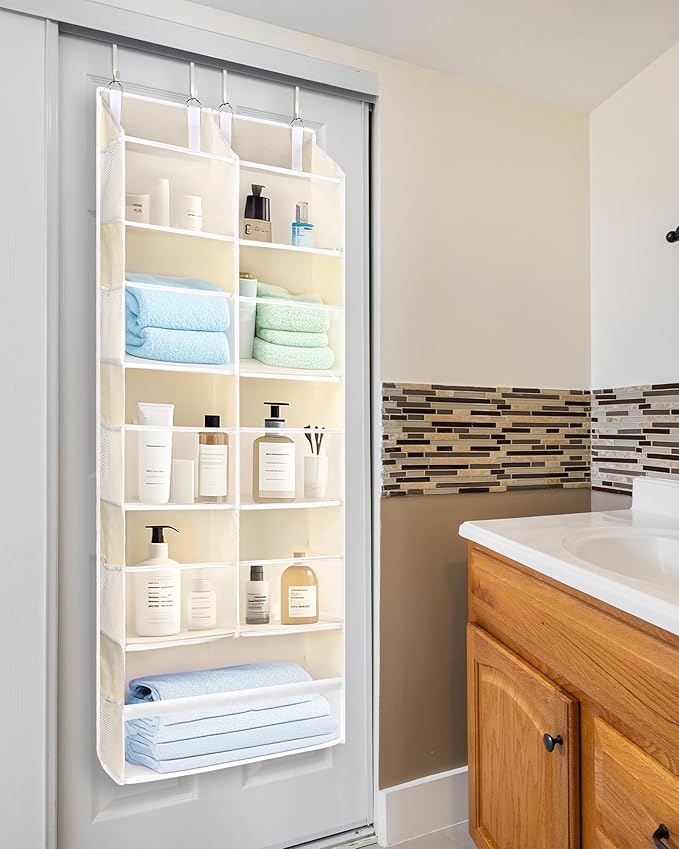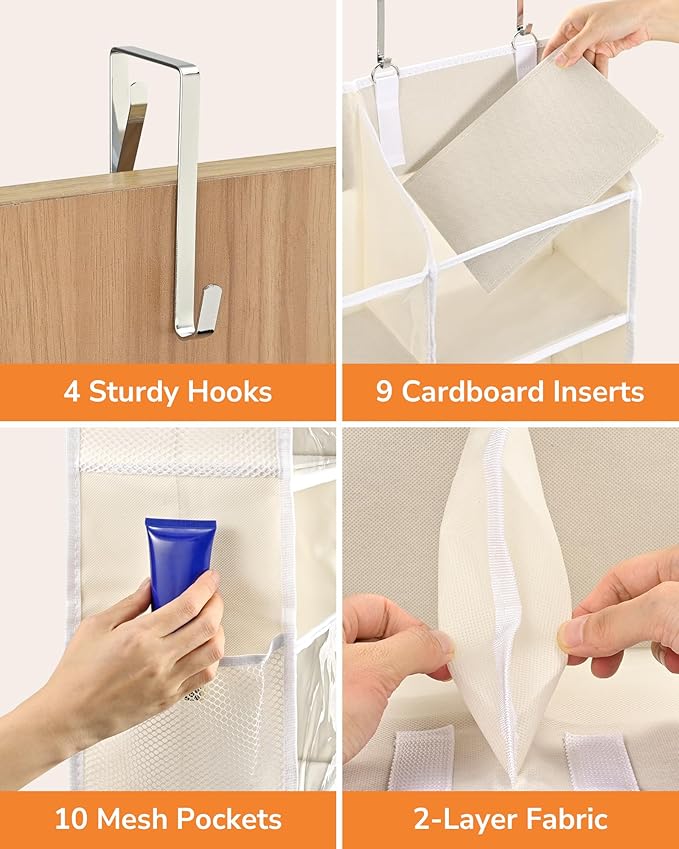 - ✅【Fits Most Doors – No Tools Required】Equipped with 2 sturdy metal hooks, this organizer fits most standard interior doors (width ≤ 1.65"). Easy to hang – no drilling, no hardware, and no hassle. Great for rental homes, dorms, or apartments