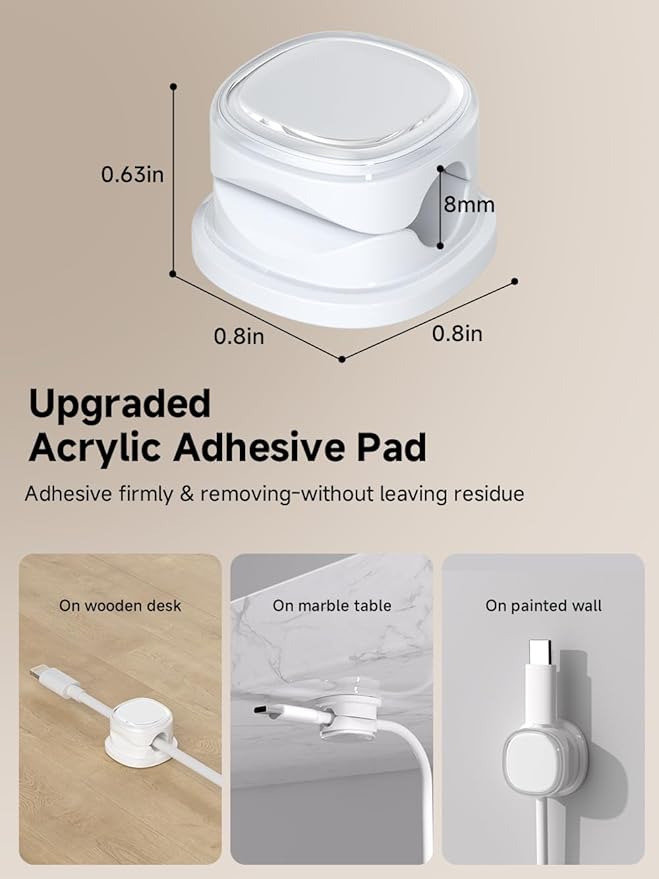 - No-Residue Acrylic Adhesive : Unlike ordinary adhesive tapes, our cable holder organizer utilizes the acrylic adhesive that is stronger and leaves no residue and won't damage your desk / nightstand or walls when removed. Just simply stick the wire holder organizer to any smooth and dry surface, such as wooden table, glass, or ceramic tiles, etc