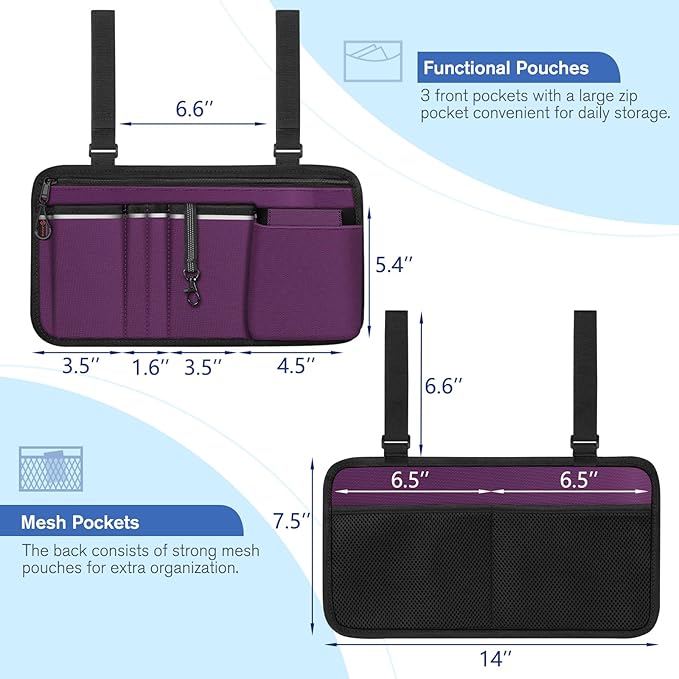 - 【Wheelchair Accessories Bag】Overall dimension: 14 x 7.5 inches (L x H), adjustable straps length: 13.2 inches. Totally 8 pockets - four front pockets with two pen slots and two rear mesh pockets hold your cell phones, eyeglasses, pens, keys, slim wallets, medication, etc.