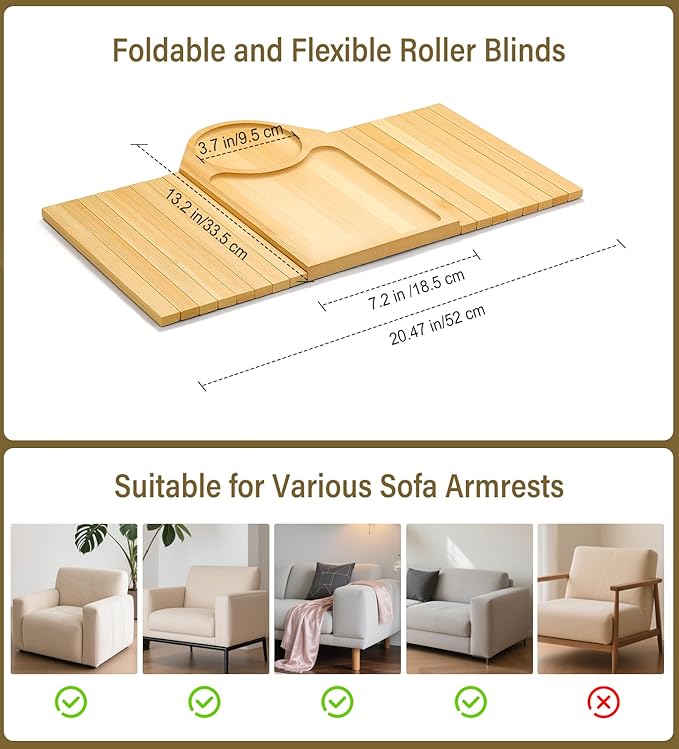 - Non-slip & Foldable Design: The bottom of the couch armrest table is designed with non-slip pad to ensure stability when placed on sofa armrests, preventing your things from tipping over or falling off. It is collapsible and can be stored in a drawer or under the sofa when not in use to save space.