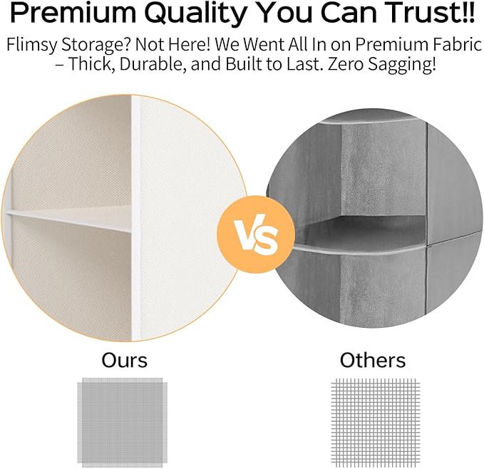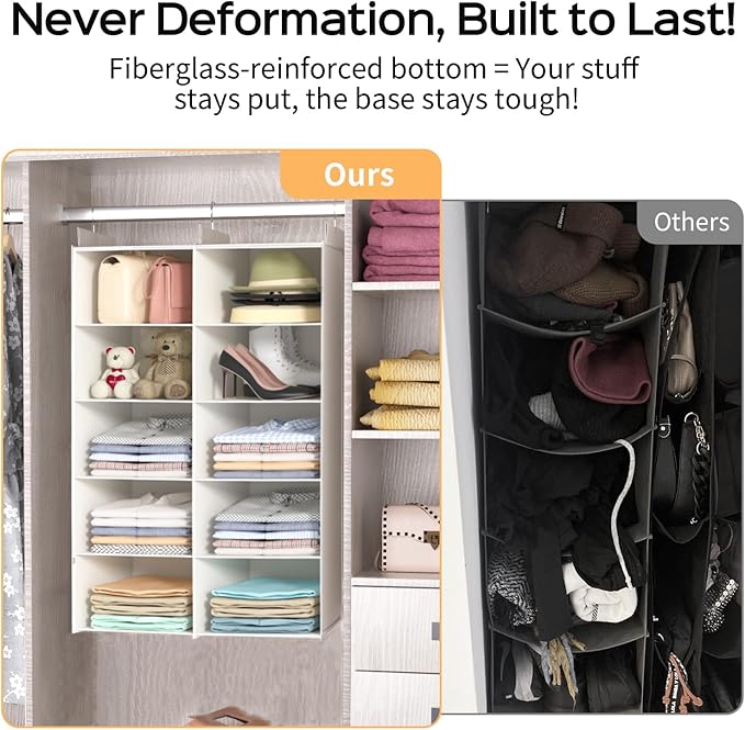 - STRONG HOOKS CONSTRUCTION - Equipped with a robust hook system, these closet organizers and storage shelves securely hang from any closet rod, accommodating even heavier items.
