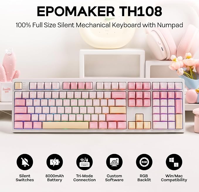 - 100% Sized, 100% Spectacular Performance: Level up your setup with the TH108 full-sized gaming keyboard, engineered for intense gaming sessions and demanding office tasks. Built to last, this full-sized mechanical keyboard features 108 double-shot PBT keycaps with unfading colors that withstand the test of time, and thick plastic body that weighs over 1.2kg for un-moving stable typing. The premium build quality does not end in exterior parts, with powerful 8000mah battery and multi-time lab tested gaming chips, the TH108 gaming keyboard promises 2ms super low latency in cable mode and 1k polling in convenient 2.4Ghz wireless mode, for swift and stable execution of complex in-game maneuvers.