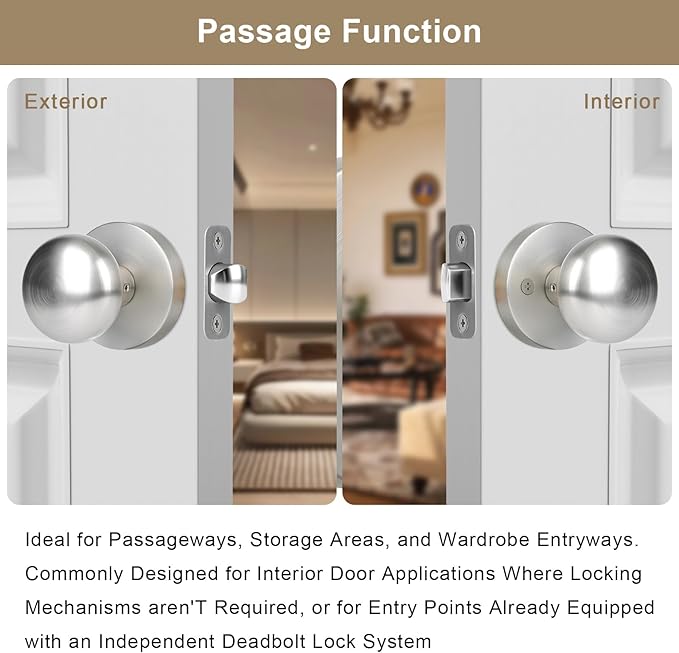 - 【Effortless Passage Functionality】Perfect for spaces without locking needs. This non-locking passage door knobs ensure seamless access in hallways, kitchens, living/dining rooms or guest rooms