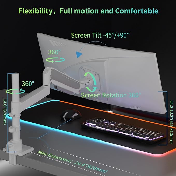 - Fully Adjustable Single Monitor Stand : This single monitor mount offers -45° to +90° tilt, 180° swivel, 360° rotation adjustment.What's special is that it has dual height adjustment:① Column Height: 14.6" (370mm),② Monitor Arm Lift Range: 12" (305mm),This design allows for smooth stacking height adjustment;Plus,maximum extension to 24.4"(620mm) with pneumatic spring lift. It caters to your preferred Angle of view and adjusts smoothly and effortlessly