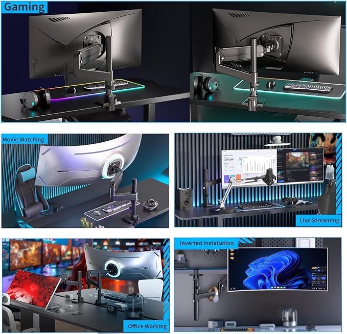 - High-Quality Desk Mount: Constructed with sturdy materials like high quality steel and aluminum, it has passed 30,000 motion tests to ensure long-lasting durability and reliable performance.Besides,featuring a bionic cantilever that rotates smoothly and hovers freely for monitor stability. The premium spring assist arm counterbalances monitor weight for ergonomic height adjustments, making it ideal for office,home and gaming setups and ensuring worry free use
