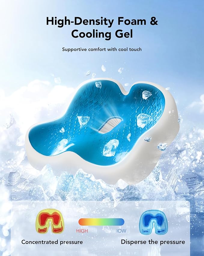 - Cooling Gel for Lasting Comfort: This breathable cooling gel seat cushion enhances comfort during those long hours spent at your desk or in the car. The combination of memory foam and cooling gel provides pressure relief and reduces heat build-up.