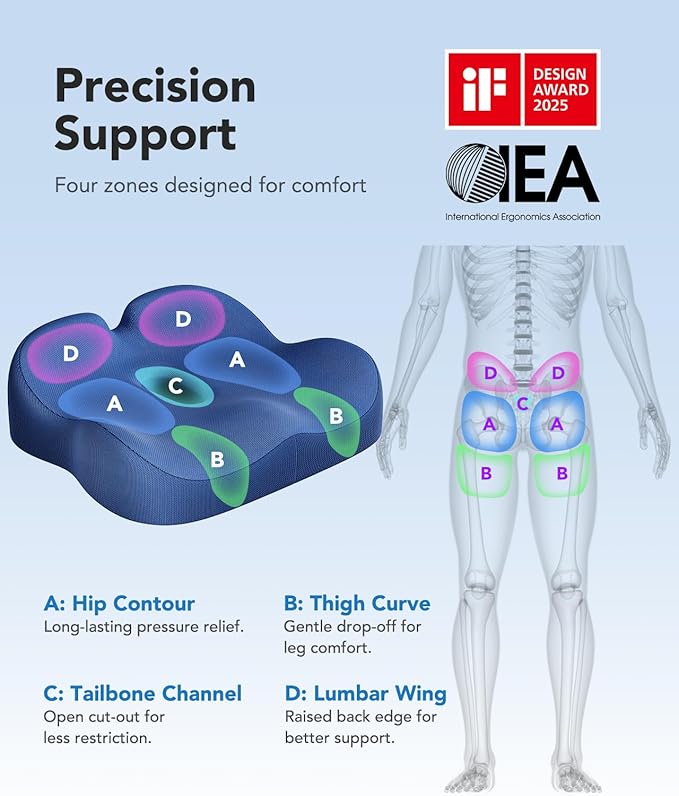 - Ergonomic Zones and Targeted Pressure Relief: Featuring scientifically designed zones like sit bone contours, sculpted leg channels, and a pressure relief cutout, this seat cushion helps to improve posture and distribute pressure away from sensitive areas. It's a quality option in seat cushions for office chairs and a great way to enhance everyday seating comfort too.