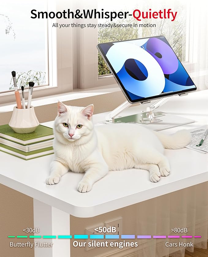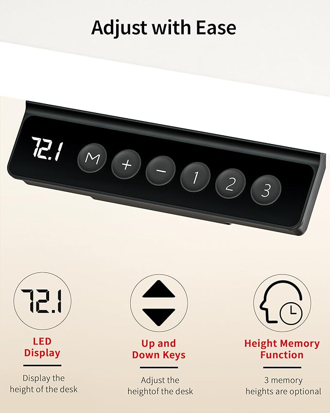 - 【Ergonomic Height Adjustment】This adjustable electric desk with 3 memory presets, you can easily save and recall 3 customizable heights for sitting and standing with a single button press. This sit stand desk adjusts smoothly from 27.6" to 45.3" in height with low noise <50 dB, it won't disrupt your workflow or influence families and pet rest