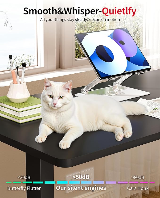 - 【Ergonomic Height Adjustment】This adjustable electric desk with 3 memory presets, you can easily save and recall 3 customizable heights for sitting and standing with a single button press. This sit stand desk adjusts smoothly from 27.6" to 45.3" in height with low noise <50 dB, it won't disrupt your workflow or influence families and pet rest