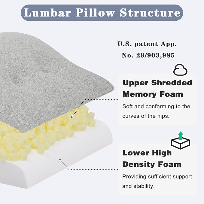 - [Double-Layer Patent Design] Patent Application No.: 29/903,985. The lumbar pillow features a double-layer structure with a top layer of premium shredded memory foam and a bottom layer of high-density foam. This combination offers superior elasticity and support compared to regular foam, achieving the perfect balance of softness and firmness, conform to the natural curvature of your back, offering added spinal support, effectively alleviating discomfort from prolonged sitting.
