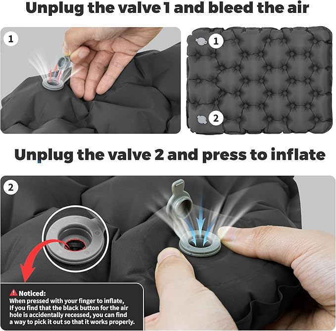 - Quick Inflate and Deflate: Our Push-Press cushion has been improved with a press valve, just need to press for about half a minute, you can fill up the cushion, if you finish using it, then pull open the other valve to deflate it quickly.