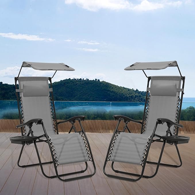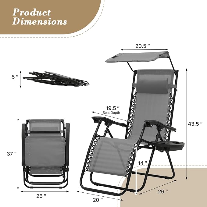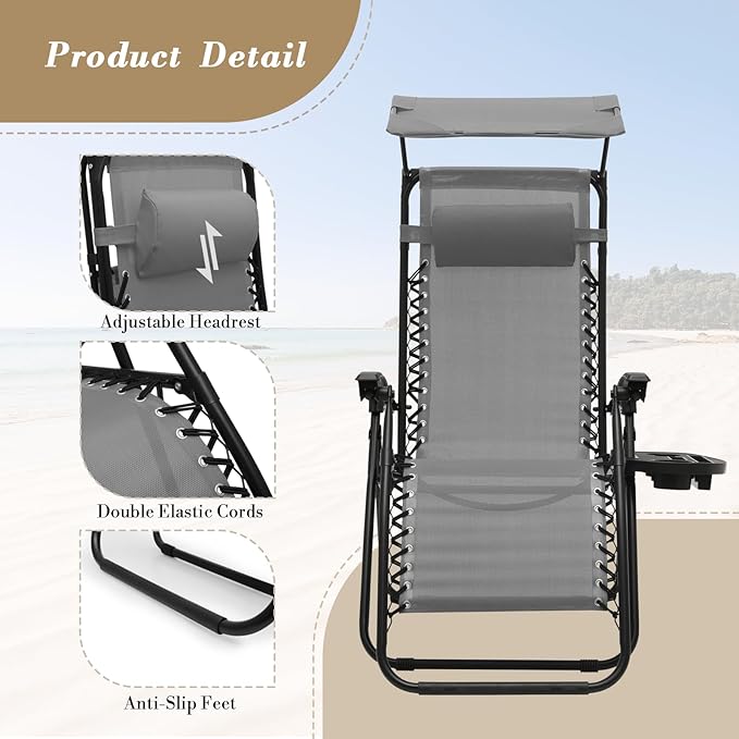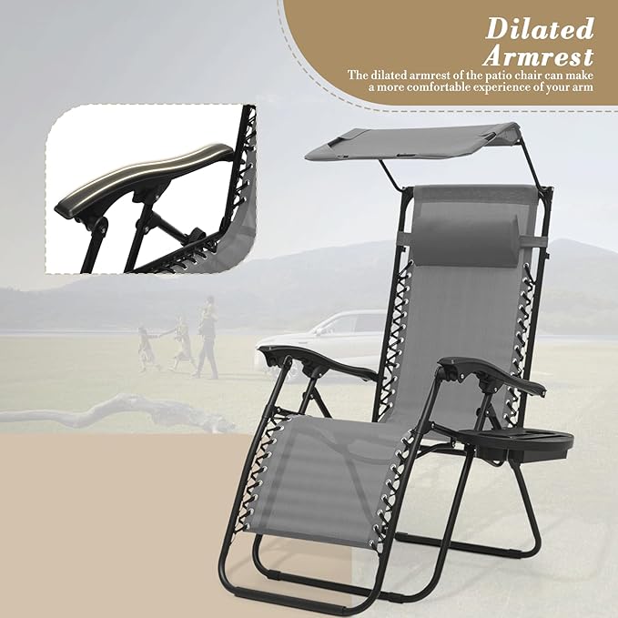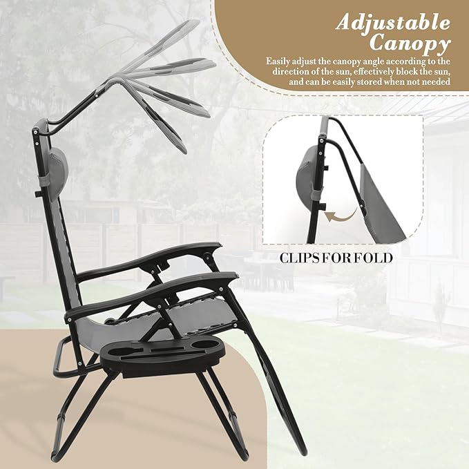 - Adjustable Canopy for Sunshade: This zero gravity lounge chair includes a canopy shade to protect your face and eyes from the sun. The adjustable canopy can be rotated for shade or sunlight, enhancing your relaxation.