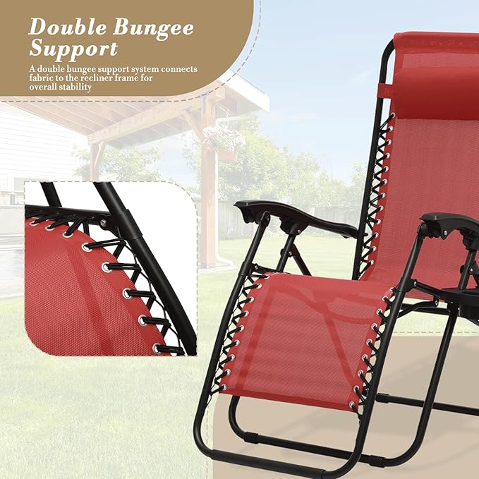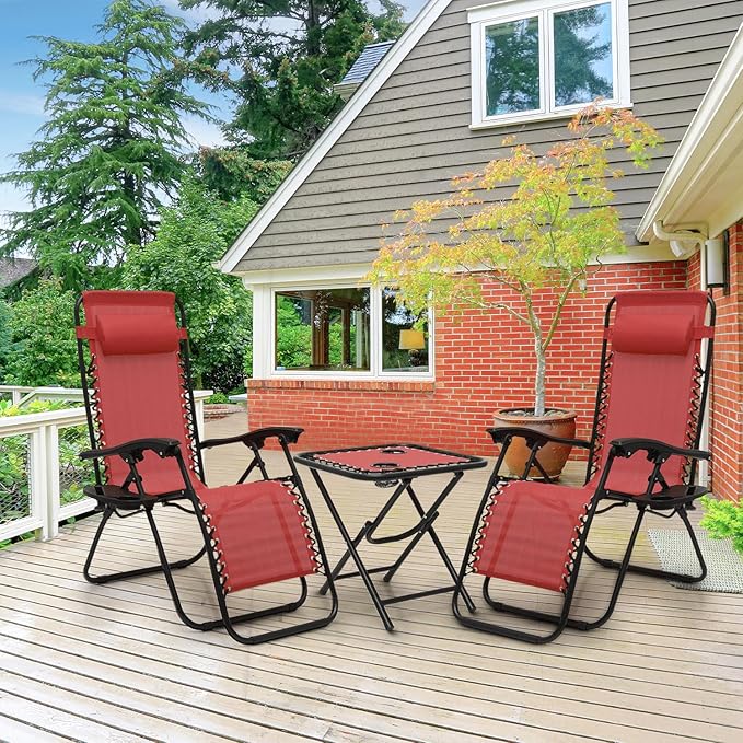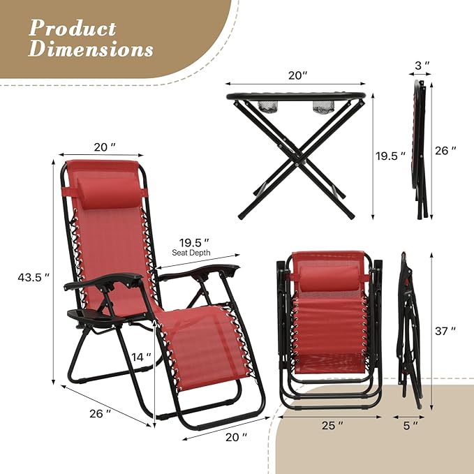 - Lounge Chairs Set of 2 with Side Table: The complete set features two zero-gravity chairs and a folding side table for comprehensive outdoor relaxation solutions.