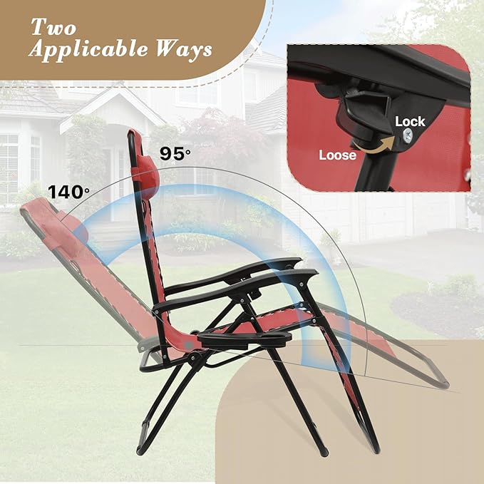 - Adjustable Locking System: The zero-gravity lounge chair adjusts from 95 to 140 degrees, with twist knobs to lock it securely in your preferred position.
