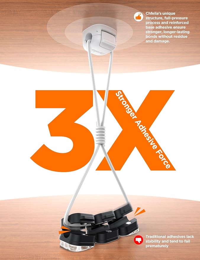 - ✅【Superior Adhesive Strength】Chfeila cable managementstarts with our exclusive adhesive system. Engineered with a unique base and pressure-holding technology, it delivers exceptional, lasting stickiness on diverse smooth surfaces: glass, metal, wood, walls, tile, car dashboards (avoid outdoor use). Removes easily without damage or residue, includes 4 extra pads for replacements. Your reliable cord organizer for desk or cord holder for nightstand. Effortless wire organizers for cords placement.