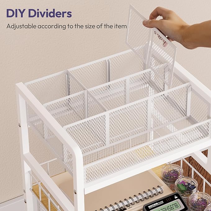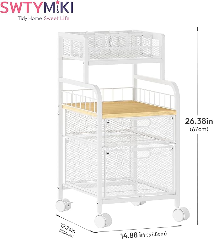 SWTYMIKI Rolling Cart with Drawers - Metal Utility Cart with Wood Shelf, DIY Divider and Locking Wheels, Craft & Art Cart Organizer for Under Desk Storage for Home Office Studio, White