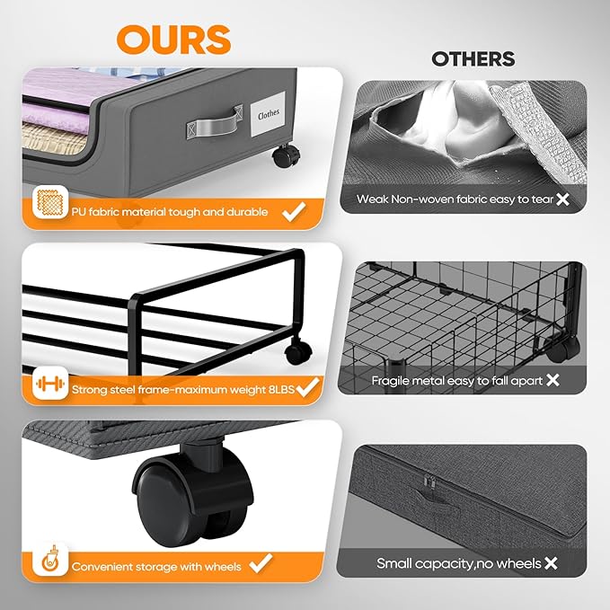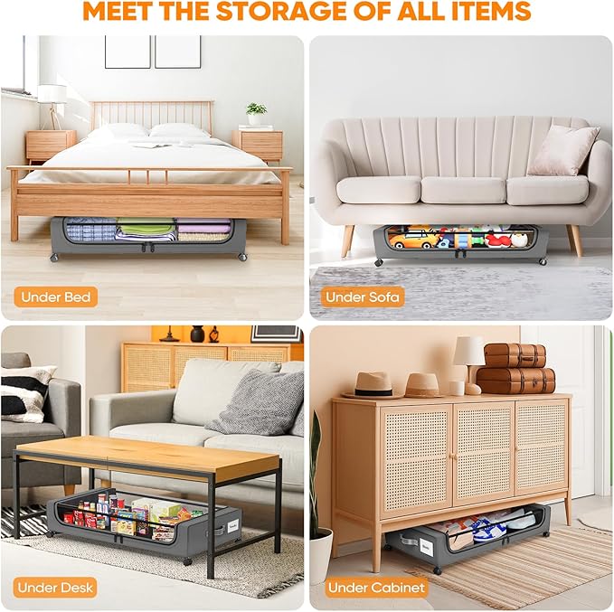- Rolling Under Bed Storage – Glide Out in Seconds. Each under bed storage container is designed with 4 smooth 360° caster wheels, letting you slide bins in/out effortlessly without lifting the bed or scratching floors. Perfect for quick access to clothes, shoes, toys, or books—daily routines become faster and easier.