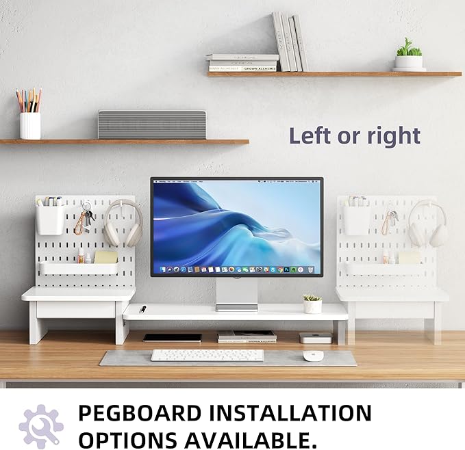Pegboard Monitor Stand Riser,Computer Monitor Stand with 2 Hooks Cable Management Desk Organizer and Drawer for Laptop,PC,Computer,Printer,White