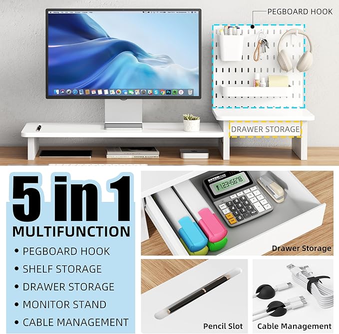 - Maximized Multi-Zone Storage:Boasts ample storage across three zones: back panel pegboard, long shelf, and drawer. Ideal for organizing multi-type items—from office supplies to gaming accessories—while elevating your monitor for a tidy, efficient desk setup.