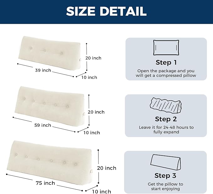 - Precautions: For easy transportation, our packaging uses a vacuum-sealed design. After receiving the headboard pillows, please let it sit for at least 48 hours to allow it to fully expand and eliminate any odors, providing you with a comfortable pillow experience