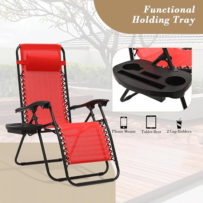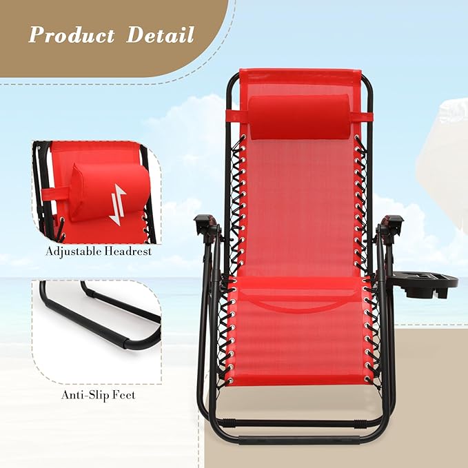 Athena Collection Zero Gravity Outdoor Lounge Chairs Set of 2, 25" Width Pool Lounge Lawn Chairs Reclining with Cup Holder, Outdoor Chaise for Beach Patio Backyard Outside, Red