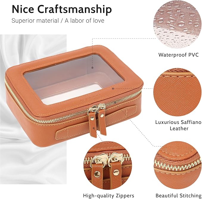 - ❤【LUXURY DESIGN】Measuring 7.9” x 5.7” x 2.7”(20 cm x14.5cm x 7cm), our makeup bag is leek and stylish, this makeup travel organizer was designed in a minimalist boxy shape and a versatile brown color. Crafted in beautiful PU leather and finished with polished hardware, it's the clear pouch you'd be happy with sitting out on display beside you.