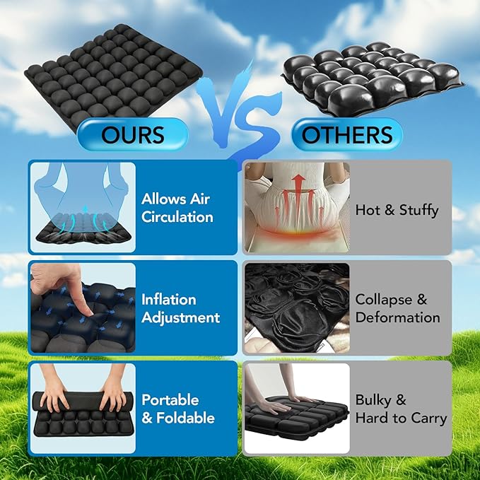 - Advanced Ergonomic Support: 56 dynamic 3D air cells adapt to your body’s curves, our high resilience chair cushion reducing hip and back pressure by up to 30%. Scientifically proven to correct posture and prevent aches during long sitting sessions—ideal for office chairs, travel, or wheelchairs.