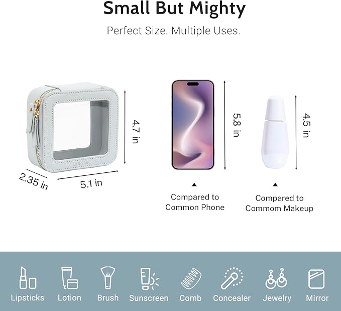 - ❤【LUXURY DESIGN】Unlike other flimsy clear makeup bags, our mini cosmetic case(measuring 5.1’ x 4.8’ x 2.35’) which made of premium saffiano PU leather and thick vinyl can keep a good structure and. The small cosmetic bag was designed into a minimalist boxy shape, crafted in beautiful PU leather and finished with polished hardware. Together with the beautiful stitches and whisper-quiet metal zippers, it’s durable for long-lasting use.