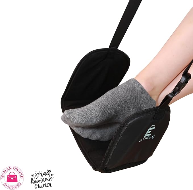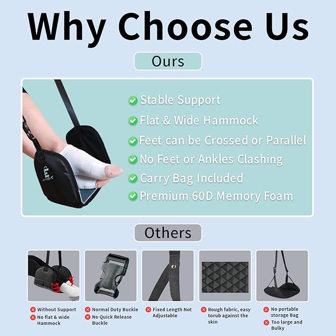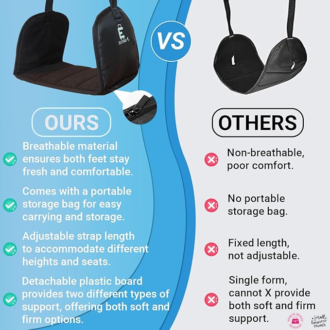 - ★ Travel in comfort, anywhere - Long flights, drives, or workdays at your desk can be tough on your legs, feet, and back. Our airplane foot hammock gives your feet and lower legs the lift they need to reduce stiffness, swelling, and fatigue so you can arrive refreshed and relaxed. The removable hardboard base ensures support for your feet and legs while being easy to remove if necessary.
