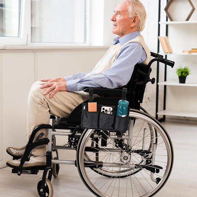 - VERSATILE APPLICATION:Wheelchair pouch side pocket can be hung on the back or sides of most wheelchairs, walkers, or scooters, offering convenience and accessibility for elderly and disabled individuals