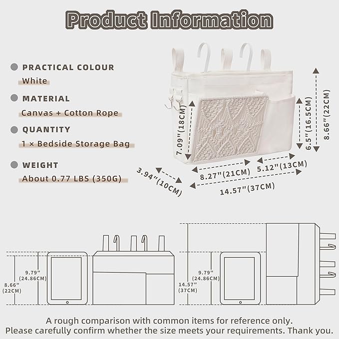 - 1. Good-quality Materials: This bedside organizer bag is crafted by skilled artisans using sturdy canvas and cotton rope. It is not only durable but also helps us reduce our environmental impact. The white color design makes it also a great decoration, suitable for Bohemian decoration, coastal decoration, etc.