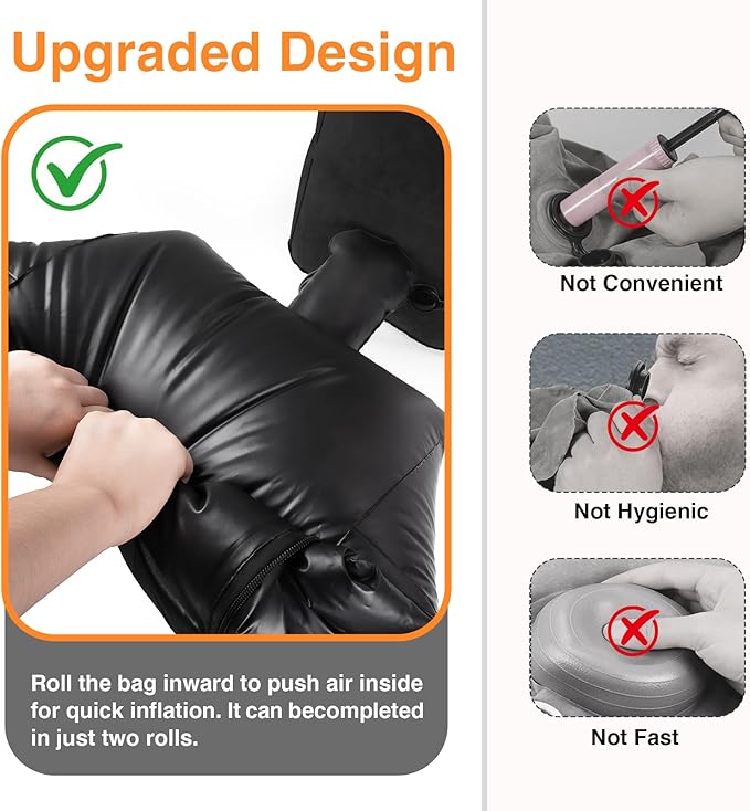 - Rapid Inflation & Deflation: The upgraded inflatable footrest fills up in seconds with just 2-3 presses of the quick-inflate bag—no pump or blowing required. It deflates in a remarkable 3-5 seconds, making it three times faster than conventional methods. The dual-purpose bag also doubles as a convenient storage pouch for easy hanging and compact packing.