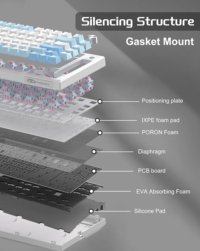 - 5-LAYER SOUND ABSORBING FILLING: In order to improve the noise situation, this gasket keyboard is equipped with a IXPE foam pad, PORON foam, diaphragm, EVA soundproofing foam and silicone absorbing pad in the gaps between the positioning plate, PCB board and bottom. This reduces the resonance space inside the keyboard, thereby suppressing hollow sounds and making every key press comfortable and pleasant. For gamers and office users, this keyboard is a great addition to the desktop.