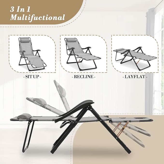- MULTIFUNCTIONAL 3 IN 1: The triangle locking system of this zero gravity lounge chair lets you lock the outdoor chaise lounge in sitting, reclining, or flat positions for versatile use.