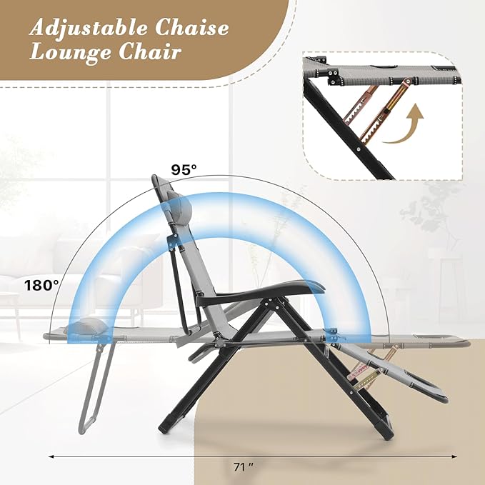 - Comfort: The folding chaise lounge chair set of 2 offers adjustable recline angles and a cushioned headrest for ultimate relaxation. Its ergonomic design improves circulation and reduces spinal pressure.
