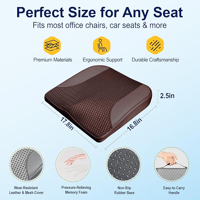 kingphenix Car Seat Cushion – Memory Foam Pad for Driving Comfort – Boosts Height and Relieves Coccyx & Lower Back Pain – Car, Truck, Office Chair (Leather & 4D Mesh Brown)