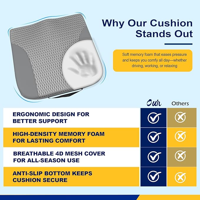 - Relieve Lower Back Pain - Prolonged sitting or driving causes several issues such as lower back pain and body aches. This comfortable car seat cushion could relieve the pain of sciatic nerve, tailbone and lower back