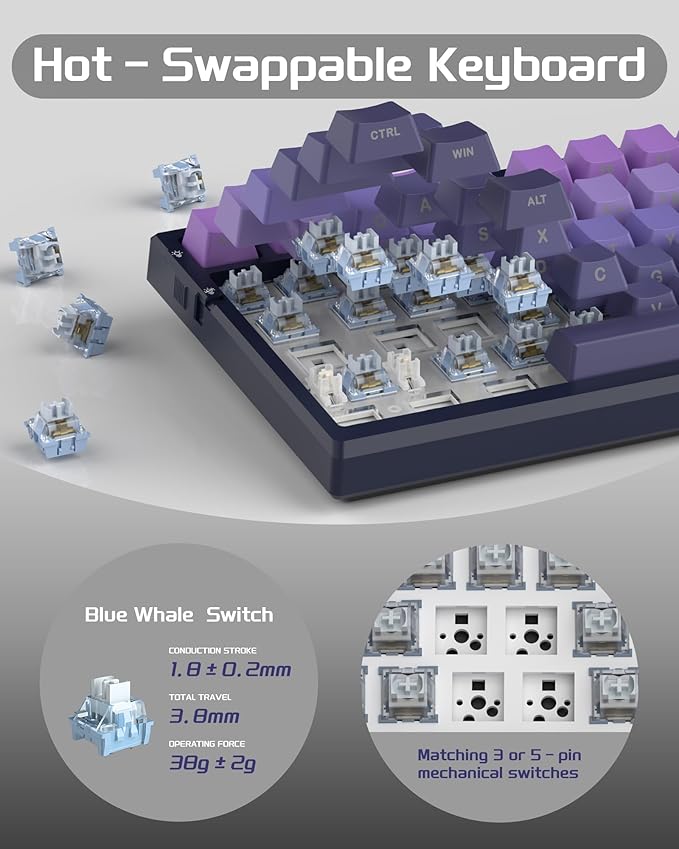 - HOT-SWAPPABLE SOCKET & PRE-LUBED CUSTOM SWITCHES: This 75% mechanical keyboard is compatible with 3-pin or 5-pin switches, allowing you to personalize your keyboard. The switches are individually removable and can be replaced in seconds. The SKY81 keyboard utilizes MageGee's finely tuned switches, which are pre-lubricated at the factory and built to last up to 70 million keystrokes for responsive and creamy typing.