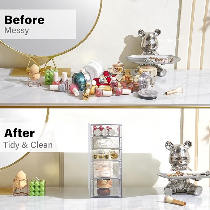 - Space-Efficient Design with 5 Drawers: Compact size (10″H x 4.2″W x 6.9″D) fits neatly on vanities, bathroom counters, or inside cabinets. Five drawers make use of vertical space, suitable for organizing crowded surfaces and optimizing storage in smaller areas.