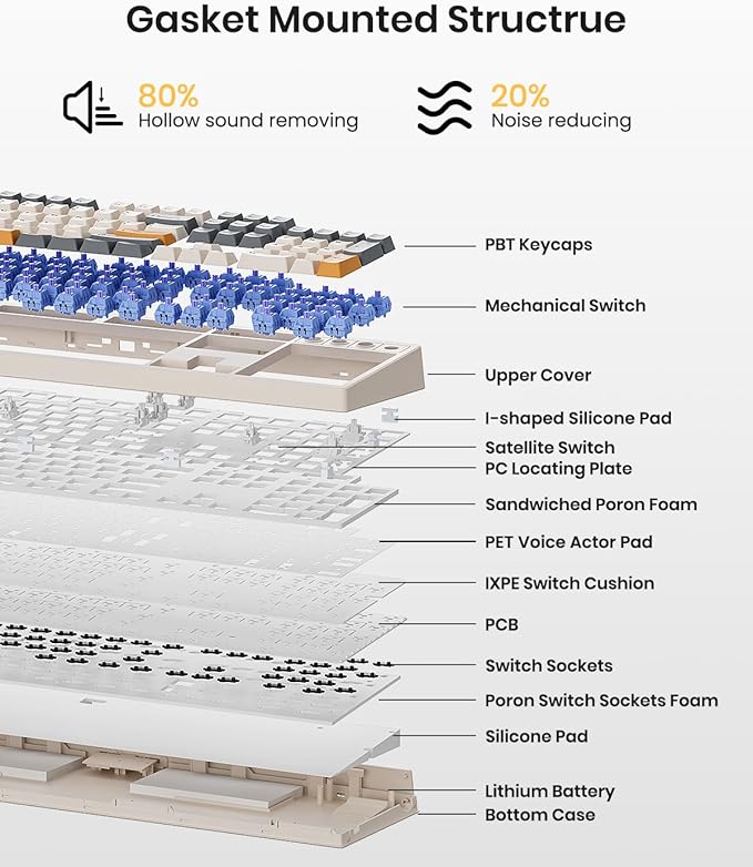 - 【Reunited with Kisnt’s Creamy】Designed with your comfort in mind, this gasket keyboard absorbing sound effectively. Enhanced with a silicone plate and base dampener, five layers of sound-dampening foam, the keys are just the right combination of clicky and clacky, even the space bar and other larger keys without being overly loud or hollow! It's the kind of sound that makes people around you comment " how nice it is "and generates interest in mechs, instead of "what‘s wrong with your keyboard?" The feeling will have you never back to a regular keyboard again.