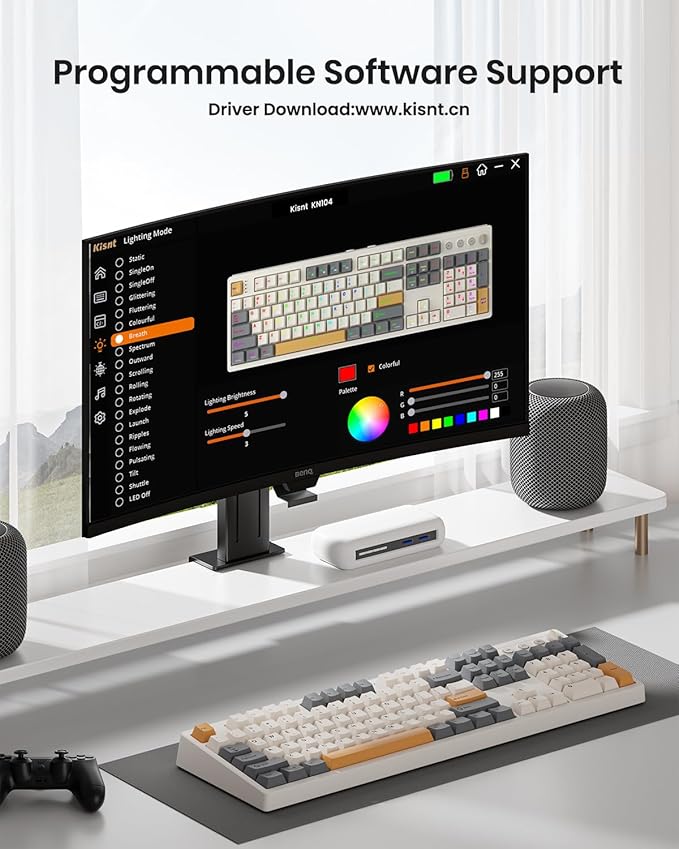 - 【RGB Lighting and Programmable】The 100% sized keyboard has 20 RGB lighting effects, which you can adjust brightness and flow rate. The decorative light bars on both sides are colorful and add a strong gaming atmosphere. Effortlessly create keyboard shortcuts, macros, and customize RGB LED colors through Kisnt dedicated software. Note:The driver only supports windows system in wired/2.4G mode.