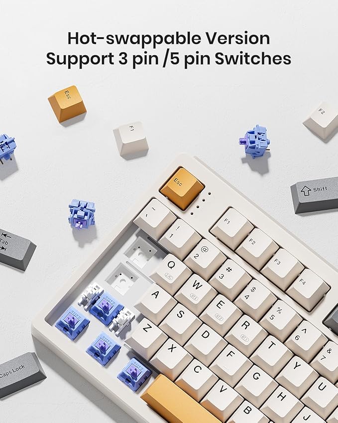 - 【Hot-swappable Custom Keyboard】Have fun customizing the acoustic performance and typing feel to your own preference. Hot-swap PCB allows you to replace 3 pins/5 pins switches freely without a soldering issue. The typing perception is buttery smooth thanks to the pre-lubed Bsun linear switches. The retro look blends seamlessly into the office workspace. All of these upgrates lead you to a whole new level of experience.