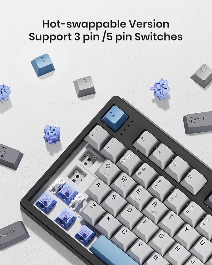 - 【Hot-swappable Custom Keyboard】Have fun customizing the acoustic performance and typing feel to your own preference. Hot-swap PCB allows you to replace 3 pins/5 pins switches freely without a soldering issue. The typing perception is buttery smooth thanks to the pre-lubed Bsun linear switches. The black scheme provides a classic and versatile look. Whether you want calm or focused, it makes your office corner feel like yourself