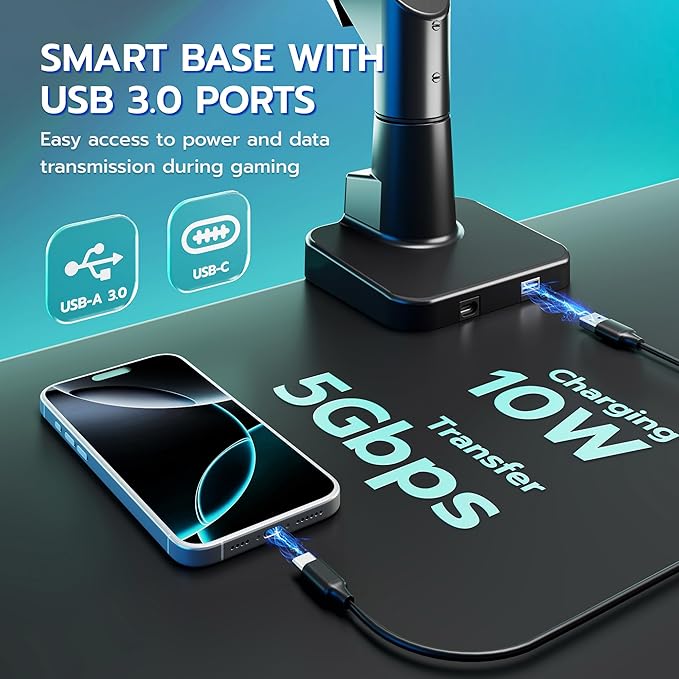 - 【Smart USB Integration】Designed with a smart base with USB function, this heavy duty monitor arm helps you connect your devices easily and effortlessly. The built-in USB-A 3.0 and USB-C ports expand on the ports easily available to you on your desk, providing convenient options for charging and data transmission. The two integrated USB ports allows simultaneous charging for your two devices at any time.