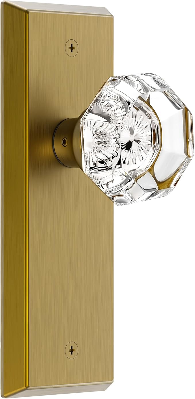 Glass Door Knobs for Interior Doors - Vintage Crystal Passage Closet & Hallway Door Knob - Diamond Cut Door Handle - Antique Brass Finish (1 Pack)