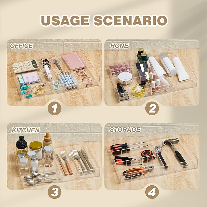 - Diverse Functionality: our clear desk drawer organizer is versatile, ideal for office supplies, small desktop items, cosmetics, jewelry, tableware, silverware, and even bathroom supplies; It can be your good solution for diverse storage needs