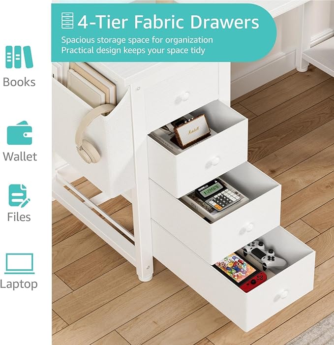 - Working Desk with Ample Storage Options: Computer desk with 2 storage shelves and 4 𝙁𝙖𝙗𝙧𝙞𝙘 𝘿𝙧𝙖𝙬𝙚𝙧𝙨, you can try this two installation methods (left or right), and the shelves have two different heights of installation, you can customize the storage space to your needs. It also have one side storage bag, perfect for holding magazines, notebooks, bags or small electronics